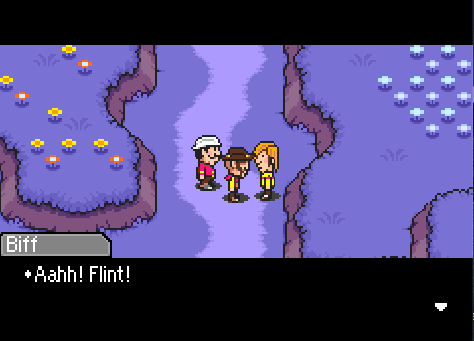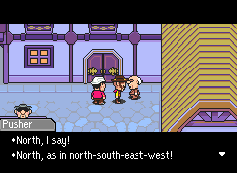 I know it sounds pretty simple, almost obvious: people talk about people all the time. But the outcome is much more effective than it initially appears. When characters let us into their world in this way, especially in RPGs, it is that much more effortless to truly become a part of it. In a more traditional RPG, you might approach a character in a town who says, “Swords can be purchased in the armory!” In Mother 3, you might approach a character who says, “Hinawa has always been so kind to me—she planted the flowers right over there.” Or, if it’s Pusher, “North! North I say!”