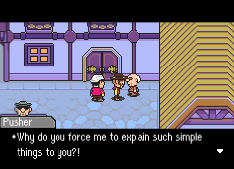 To be fair to both Jackie and Pusher, they’re mostly providing some comic relief. I don’t want to position them as prime examples of Tazmily’s flaws when they’re both bringing a smile to my face. Whether you say “Yes” or “No” to Jackie when he asks if you need help, he’ll still chicken out either way. Not everyone can be a hero in every story! And while Pusher is definitely an asshole, his speech to Flint is so ridiculous, aggressive, and over the top that you can’t help but laugh. I can imagine Flint raising his arms in conciliation and saying, “Okay, okay. We’re going, we’re going!” What use does a town like Tazmily have for wealthy families, anyway?
