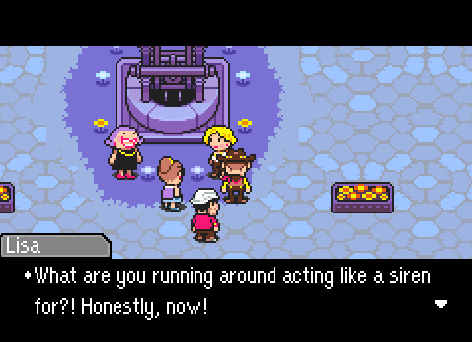 But if I were to head directly north, the next save frog could be encountered fewer than thirty seconds after the previous one, and, on this blog, we like to take things slow. I do want to talk about Mother 3’s linearity in comparison to EarthBound’s meandering, and I’d like to talk about some of these new NPCs as well, but with the encroaching flames, the background clanging of the siren bell, and the constant telling-me-what-to-do from everyone, I’m starting to feel a little stressed out.