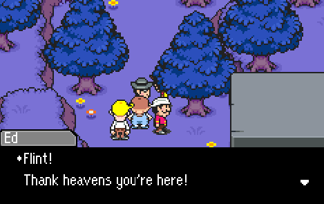 And last, but not least, of our new faces is the tuxedo’d Ed, who appears immediately thankful that Flint is on the scene. Ed’s design has always reminded me of the real dressed-up NPCs from EarthBound, and I love what he contributes to Tazmily’s mish-mash of styles. Butch and Flint could belong in a western film, Ed and Ollie could be on their way to an office job, and Thomas–I’m not sure what Thomas is even wearing, to be honest with you.