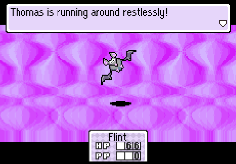 I know I’ve said this in a different post, but the psychedelic backgrounds are one of my favorite things about EarthBound and Mother 3 (Mother’s backgrounds are just black). I have nothing against how this fight would be portrayed in other RPGs, which would probably include a few different Sunshine Forest backgrounds. Maybe they’d even show Flint and the bat fighting under this tree.