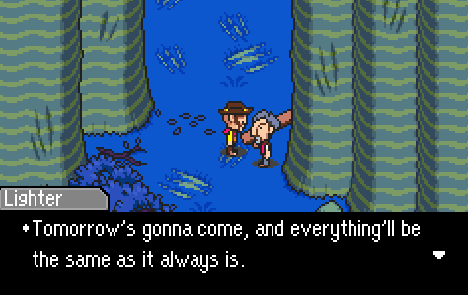 I’ll be honest: there are so many directions I want to take this conversation. I want to talk about what this means for Flint as a character, what this means for Mother 3 as a game, what this means for the Tazmilians who witnessed it, and what it means for the millions of Tazmilians (okay, maybe not that many) who don’t know yet. The last thing I should mention before jumping in to who-knows-how-many digressions is that this is the first time we hear “The Love Theme,” which is Mother 3’s central, thematic song. It may not appear in as many forms, or through as many motifs, as the Pigmask Army’s theme, but it will reappear many times throughout the plot, and each time it kicks your heart right where it hurts.