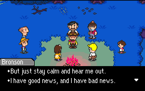 But no matter how you look at it, it is just a game, and it’s not a true story. So to get this point across, I tried to make it as exaggerated as I possibly could. When Bronson tries to break the news of Hinawa’s death, he says, “I’ve got good news and bad news.” But didn’t you find that to be a rotten thing to say?