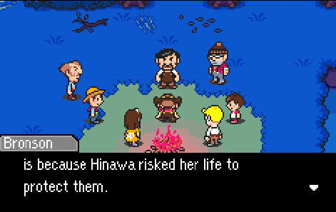 I’m also sure that, though the Tazmilians can’t express it, they’re still as shocked as the player. When we see Hinawa’s funeral, we learn just how deeply she connected with all the Tazmilians (all three million of them!). And, just as shocking as Hinawa’s death, I remember feeling shocked that, again, a Gameboy Advance game could pull off such an amazing scene. I remember feeling shocked that NPCs, that Abbot and Ollie, the two most unassuming dweebs in town, got decked by Flint with a flaming stick. Usually in RPGs, the non-playable characters sit around and spit out dialogue. Here, they are truly a part of the drama.