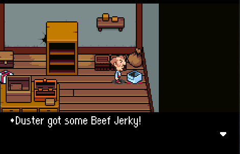 Man, I never get tired of watching Duster use the Wall Staples. The Wall Staples, to me, fall right in line with the lovely assortment of inventions from EarthBound, like the Octopus/Pencil Eraser, and any of the Apple Kid inventions, like the Zombie Paper (which, if you’ve forgotten, is a sticky paper that catches zombies). I also love the starting animation, where Duster whirls around and whips out the staples.