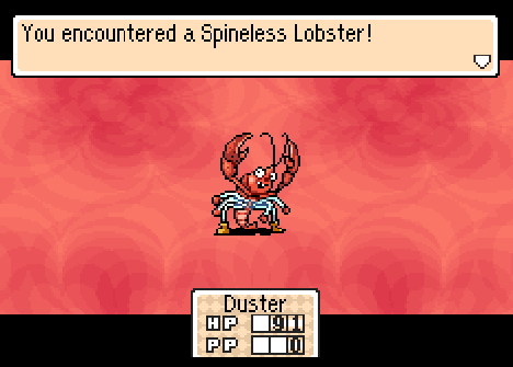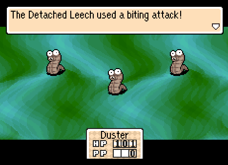 Anyway, I like this area. It’s okay that it’s easy. The leeches and lobsters are perfect for testing out Duster’s Thief Tools in a more relaxed battle setting than the zombie men, zombie women, zombie dogs, and zombie headstones. At times, I found myself listening to the music and absent-mindedly hitting ‘A,’ which is the exact gameplay habits that many people chastise JRPGs for. To me, though, I just felt like I was relaxing and walking around in a weird underground tunnel. Nothing wrong with that!