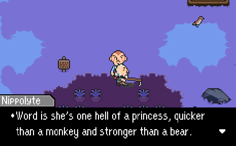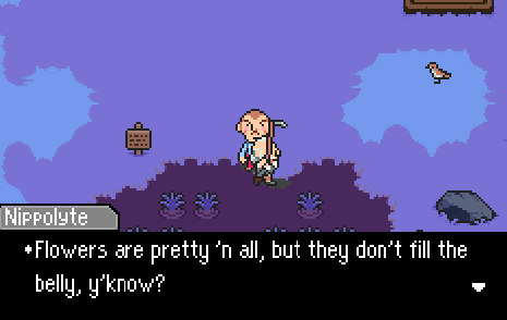 Personally, I had never talked to Nippolyte much on my previous playthroughs, and even though I liked his visual design as a character, I didn’t put much effort toward getting to know him. And I’ve gotta say–Nippolyte interests me! Why is it that the old boys of the town, like Wess, Nippolyte, and Alec, know all the best secrets? Is this stuff common knowledge to, I don’t know, people like Thomas, or Lighter and Fuel? Don’t forget, Wess claims to have served King Osohe, which must have been way-back-when as a younger thief. Can we also assume that Nippolyte has been the groundskeeper for just as long? Is there another reality where Duster, the son of Wess, and Kippolyte, and son of Nippolyte, team up and storm the castle, combining their talents as a thief and a gardener?