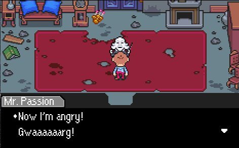 Of course, the proper way to start the battle is to say “No” to Mr. Passion, which leads to one of my favorite lines: “This is what artistic know-nothings like you blah blah!” And another nice touch is that, if you lose to Mr. Passion, he’ll change his dialogue to “Have you learned to appreciate my music?” If you say no again, he’ll say, “Now I’m angry! Gwaaaaarg!”