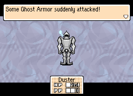 For any other subplot that Mother 3 explores, this has to be one of the best, or at least I am going to pretend it is: that there was a ghost in Osohe who nobody liked, that would possess a suit of armor on the third floor. And that Duster, Tazmily’s smelly thief, wanders in to Osohe one day and kicks the ghost’s steely ass right out of the room. I love thinking of Duster as the hero of the friendly ghosts! I mean, he even has a bit of a Beowulf thing going on at this point: he showed up to a feast after a long battle, drank some wine and ate some food, then departed for battle once more, slaying a chronic, monstrous nuisance! That’s a Tazmilian Beowulf right there!
