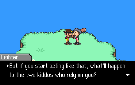 This leads me to believe that the fathers of Mother and Mother 2 were a way for Itoi to positively spin and express his own experiences as a son and as a father himself; yes, there was distance, and it was challenging, but, drawing on the parental absence of Pippi Longstocking, and harnessing the raw expression of John Lennon’s “Mother,” Itoi wrote mostly well-meaning fathers in the best way he knew how. In Mother 3, I think Itoi’s writing chops simply got better, and we meet so many different dads who all contain different lessons. Perhaps the main lesson so far can be summed up, if you recall, from none other than the lumber-wielding Lighter, who implored Flint to not abandon his fatherly duties in pursuit of vengeance. In short: put your children first.