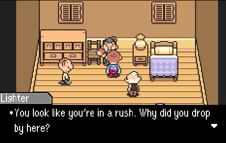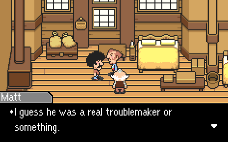 I know I’ve said this before, but I can understand why, compared to EarthBound, Mother 3 can feel a bit sparse when it comes to NPCs, especially early on in the game. However, the spectrum and quantity of the discussions more than makes up for it, in my opinion. I mean, in this particular instance, you’ve got Bob and Nana asking some interesting questions about Tazmily itself, but if that’s not your cup of bourbon, you can always head back to Lighter’s room at the inn, where the energy is pretty low-key. Both Bud and Lou will say “Wess up?” to Wess (I like to think they invented it) while Lighter will wonder what you’re doing back.