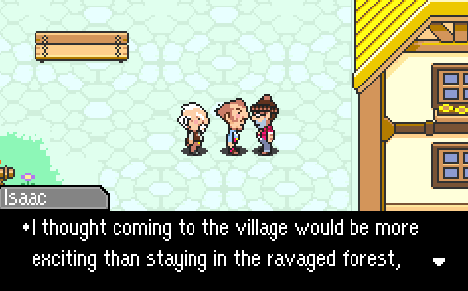 The way I think about it is like this: when you’re playing EarthBound, you never know what one of the hundreds of NPCs is going to say, so the entire world is a joy to interact with; sometimes an NPC hits you with some truly off-the-wall shit, and it’s amazing. In Mother 3, you spend a lot of your time interacting with the same, like, twenty to thirty NPCs, but the advantages are that you know the NPCs as people, and they can still surprise you. For example, as we’ll see today, Isaac returns to town, and for some reason, no one will interact with him. It makes him feel lonely!