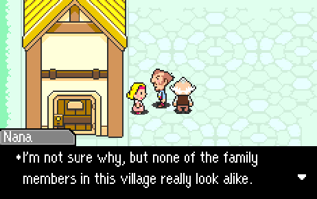 Who better to explore a thought like this than Nana, who for the first time in the game hangs out in townsquare instead of the western beach. You can find Nana hanging out outside Caroline and Angie’s house, and when you talk to her, she’ll say, “I’m not sure why, but none of the family members in this village really look alike.” Now, what would have Nana thinking about this? And what is she getting at with this thought? (And on a side note, I always thought that Duster and Wess looked pretty similar, but maybe that’s just me…)