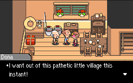 Well if you’re so enlightened Jonel, you should know that it all starts in the home! Take care of those around you first, then reflect on your life by the ocean, or whatever it is you’re doing. And to all the Jonel fans out there: I’m not trying to throw this guy under the bus or anything. I like Jonel’s design, and I enjoy his dialogue, too (most of the time). It’s just disappointing to see a handful of Tazmilians clearly dealing with some difficult emotions, but no one knows how, or cares, to comfort them. With Tazmily, it’s difficult to see the line between negligence, ignorance, and obliviousness. I’m sure if Jonel really understood that Dona was in emotional pain, he’d try to help her, but you’d also think he might have noticed something by now. Tazmilians fail to connect with each other on so many levels, and I don’t think all of them are malicious. It’s just sad to see it play out like this–villagers becoming more and more distant from each other because they don’t know how to help each other.