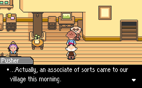 Inside the Pusher residence is actually where we get our next alarming bit of change in Tazmily. Pusher, who must wake up each morning and ask himself, “How can I be more snide today?” tells Duster and Wess that Tazmily will be building an old folks’ home soon. Pusher implies that this idea came from an associate who visited the village earlier this morning, who we can safely assume to be ???.
