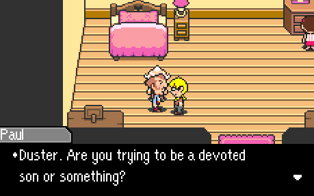 I also think it is perfectly normal and fine to see Wess as a vindictive asshole. Wess is emotionally and verbally abusive to Duster, and that doesn’t change just because we’re looking at a colorful, cartoonish game. Let’s not forget that the Mother series has never explored a father and son dynamic in quite the same way as it does with Wess and Duster. Typically, a father in the Mother series isn’t present in a meaningful way. Ness’s and Ninten’s fathers are telephones–they are never seen in the actual game, nor do they play an active role in the protagonists’ lives outside of sending them money. Jeff, a party member in EarthBound, is usually outright ignored by his father, Dr. Andonuts, and appears to walk on eggshells when his father is around. Jeff also does not live with his father, but attends a boarding school.