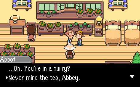 Before we head out of town, you can also check in on Paul and Linda, though they don’t have much new to say. Personally, I prefer the true Tazmilian sweethearts, Abbot and Abbey. When you drop in on these two, Abbot asks Abbey to put on some tea, then quickly tells her not to when he realizes that Wess and Duster are in a hurry. Abbey, on the other hand, says “Good evening,” but quickly corrects herself when she realizes it’s noon. The thieves must make her think it is nighttime!