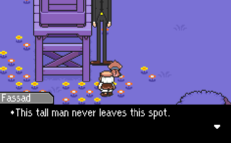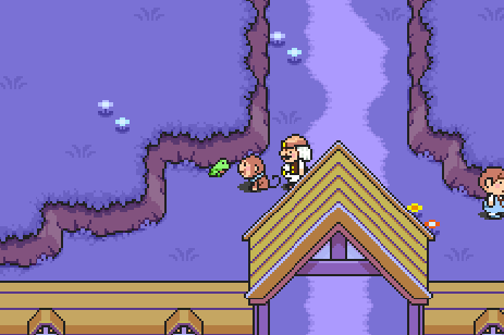 But not today, because there’s a frog to chat with, and this frog has seen many people in this townsquare. Not too long ago, he saw an anxious cowboy, running back into a forest that had been burned to a crisp. That same day, he had seen a little boy, with a knife clutched in his hand, walking with slow, strange confidence out of the town; he hasn’t seen this boy since. He’s listened to the gossiping women, to children playing, to an old man yelling at his slightly-limping son. If there’s any frog in Tazmily who’s truly tapped in to the goingson, it’s this little one.