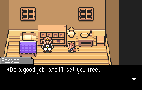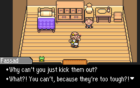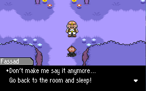 The main purpose of this scene is simply to give players context for what was going on in Tazmily while Duster was away in the castle. I don’t have much to add on the commentary side of things, to be honest, though I do get kick out of Fassad’s talking-on-the-phone sprite. I love how one of his arms is out, how he jabbers away at the goofy, antenna’d phone, how he looks like some shady businessman stalking around Tazmily at night. Though I guess that’s the thing, isn’t it? Fassad, as we’ll see tomorrow, is literally a shady businessman.