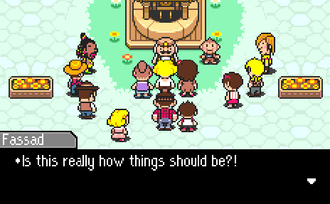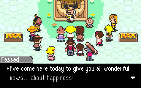 Fassad has a different plan. Fassad, who we know as oafish and cruel, can also be convincing and confident. Fassad gathers the citizens of Tazmily to sell them… happiness? In a simple town like this? What else could the Tazmilians ever need, other than some additional emotional awareness? Sure, they’re a little stunted when it comes to support, and a little insensitive when it comes to grief, but they’re, mostly, good people, right? Or are they?