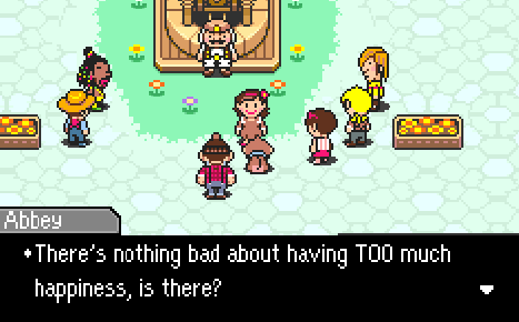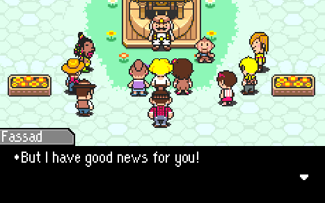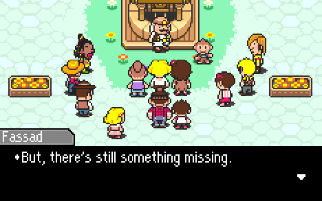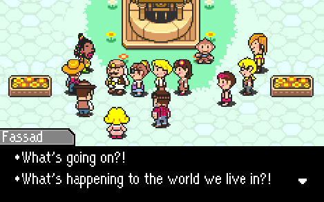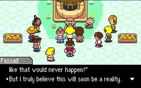 Although, Fassad doesn’t just say, “What if things were better?” He says, “What about happiness?” At this point, the first villager leaves the group, Lighter, and when I think about it, it makes sense. I mean, it’s possible that Itoi assembled random characters here–whoever would have been around, storywise, to be included the scene–but it’s also possible that Itoi has been writing and conceptualizing these characters for a long time (since at least the late 90s), so even little details like this might be deliberate.