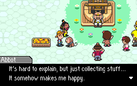 Villagers like Abbot and Abbey seem to be plain old gullible. Abbot likes to collect things, and Abbey likes to do what her husband does. She follows his lead. Sadly, though, Abbot claims that collecting stuff makes him happy, and I believe that at one point, in an innocent way, it did. Abbot and Abbey’s home is lined with plants, and I’m sure Abbot loved to collect those seeds and watch them grow. However, collecting is needless gathering, so of course Fassad can easily exploit these two (though Abbot might have latent consumerism inside of him due to something we learn much later in the plot).