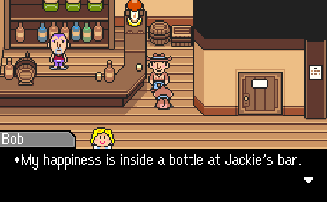 Like any hard worker, Salsa starts his shift at the bar and shoots the shit with Bob. Bob tells us something cheerful (“My happiness is inside a bottle at Jackie’s bar”) and continues to drink just as much and seemingly as often as he ever has for the entire game. Keep it up, Bob, you iron-livered cowboy.