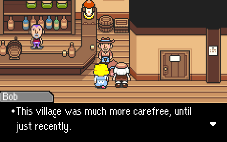 Yikes! Am I getting to serious? Look, I’m not going to give you, or even attempt at, the answers to questions like these, nor am I trying to get you to see it like me. Not that I think all of these questions are mere hypotheticals; I think our rapidly-changing world needs to develop some solid answers to capitalism’s ethical failings soon–I think it has needed to do this for a very, very long time. And I also do think that, through images like Salsa carrying “Happy Boxes” on his crunched, strained back, Itoi makes some clear statements about contemporary consumerism that I honestly believe work even better in 2021 than they did in 2006. But sometimes I also think Mother 3 is doing a smaller critique than people think; or, if not smaller, more character-specific. Through basing these commentaries on the growth of certain characters, I think Mother 3 does more than just offhandedly critique capitalism, comment on consumerism, and do whatever it does with communism. Mother is a trilogy, at the end of the day, for a reason, and this version of the world of Mother 3 would not exist if not for the stories of the previous two games.