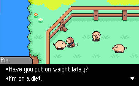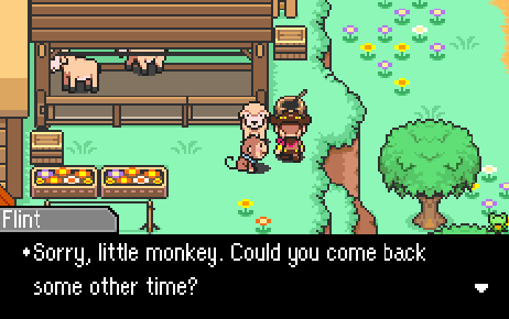 Honestly, if you want to see Salsa engage in some more dynamic conversations, the animals of Tazmily are your best bet. A couple of them will tell you where certain Tazmilians’ houses are (the people you need to deliver boxes to), and others, like a mouse and the various pigs and cows, are ready to chew the cud with the monkey-come-lately in town.