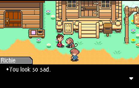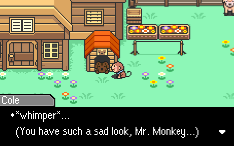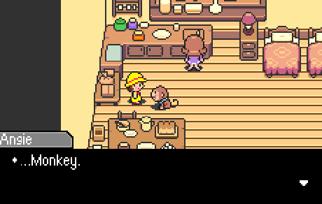 I even checked inside Lucas’s house, but the most important thing I found in there was a mirror. You’ll remember that mirrors in Mother 3 often tell us we are “Lookin’ handsome,” or that we are sporting the same old bedhead as always. Unfortunately, in Salsa’s case, the mirror reflects something much truer than physical appearance. When the poor, sad, little monkey looks into the mirror, the message reads: “What does a smile look like again?”