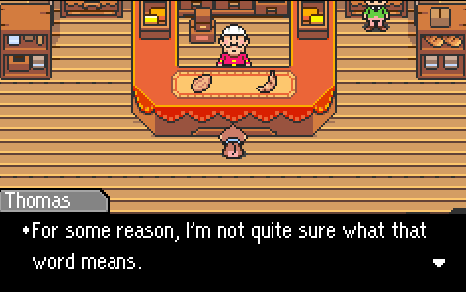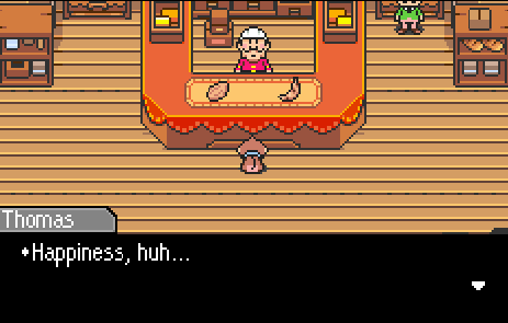 So, why wouldn’t Thomas know what it means to be happy? What is the point of Tazmily if someone like Thomas doesn’t know what that word means? And I’m not saying Thomas is the best guy in town; Reggie, Flint, Lighter, Mapson, Bronson, Duster… Tazmily is full of good men. But Thomas is still a good guy, who has done some good things, and appears to have a family and friends who like him. So what’s the deal? Is Thomas just absent-mindedly musing, here? Is Tazmily, in its preserved tranquility, too sterile? Do people trade happiness for simplicity around these parts?