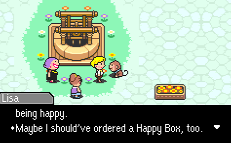 See, that’s what’s weird to me about the whole Fassad thing. In a way, Tazmily does need a wake-up call; Tazmily could be even better. Hinawa’s death (and Claus’s disappearance) has the potential to bring the town together, to show some Tazmilians how to feel… but then Fassad comes along and shoves Happy Boxes down everyone’s throats. Tazmily needs happiness, not happy boxes.