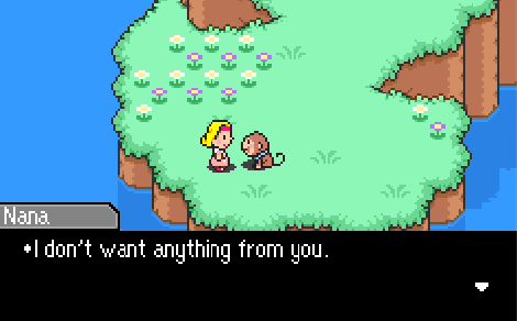 In Nana’s case, it feels in-character, because she’s always been one of Tazmily’s more tuned-in folks. I wouldn’t be surprised if it’s not Salsa she has an issue with, but the situation at large. When she says, “I don’t want anything from you,” I think she’s separating herself from the dynamic entirely, not wanting any strange shows of “happiness,” and not wanting to contribute to whatever’s going on with Salsa. I also think she could mean this in a kindly way, like a release. “I don’t want anything from you, little monkey. Be free!” Nana has always been tapped in to the mysteries of the world, since way back in Chapter 1, so I don’t think she’s trying to be mean here.