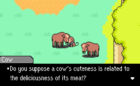Again, I’m not saying these parts of each game are supposed to be compared. I’m pointing it out mostly to say: here are two different methods that slow down the player’s typical pace of gameplay, for two different reasons. What can I say? I wouldn’t be writing a blog like this if I didn’t like how Itoi wrote games. That’s all.