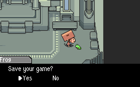 Where to begin writing about today’s frog? Some would say that the delivery of the Happy Boxes is the most important, or at least most memorable, moment of Chapter 3, while others would say it is one of the game’s most notorious tasks. If you’re playing on an emulator, you’re welcome to simply speed up the gameplay and make the Happy Box delivery a piece of cake, but I’m sure you wouldn’t be surprised to hear me say that that kind of defeats the point of the whole thing. Still, I won’t blame you for doing this. Power to the players. If you don’t want to be forced to walk slow, then speed that shit up.