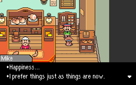 Anyway, I know this has been a pretty spacey frog. I don’t think there’s much more to talk about. In the same way as Alec, Mike will open up a bit more if you have room in your inventory for his piece of bread. “Happiness….” says Mike, “I prefer things just as things are now.” Which again makes me wonder: Tazmily’s pretty nice, but are people unhappy? Or is Fassad just getting into everyone’s heads and making them think about it too much? We already saw the headstrong Gossiping Women act all nice to him.