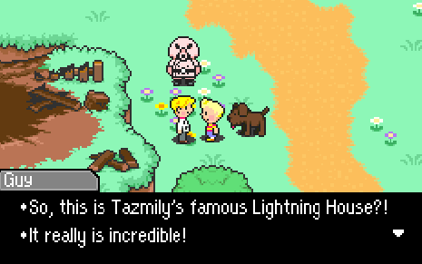 To add insult to injury, something Lucas is familiar with already, people come to look at his house like it’s some kind of exhibit. “So, this is Tazmily’s famous Lightning House?! It really is incredible!” says Guy, who’s name, it turns out, is not Guy, but more on that in a moment. The nearby Pigmask, who should fear a kid like Lucas if he’s heard any rumors of what happened three years ago, chides the boy, telling him he must really be happy if the constant barrages of lightning don’t make him want a happy box.