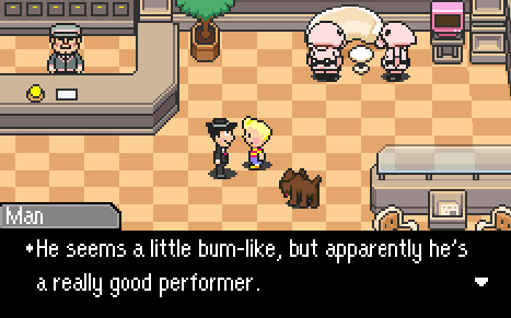 And listen: like I said before, Mother 3 balances its plot exposition and funny dialogue pretty well. The punker out in the hallway will tell you that despite being in a luxury hotel, he’s not nervous. Maybe it’s because his pockets are lined with all the money he’s been making at the factory! On top of this, a Pigmask mentions that Fassad has turned Butch’s farm land into a training ground for the army, and a businessman says something about a guy in a band named Lucky. He’s a little bum-like, but he’s a good performer.