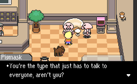 And I could be wrong, but I feel like Itoi has probably missed saying those types of things to players for the last three chapters (or the last 11 years) where narrative took a front seat. Now that Mother 3 has opened up, the pace has changed drastically, and the player can take their time without someone constantly telling them where they can and cannot go. More often than not, NPC dialogue in previous chapters almost always had to do with the story, or with building character. There’s nothing wrong with either of those things, but I know I, and I’m sure many other Mother fans, start to miss the good old fashioned Mother non sequiturs hiding behind any NPC. Honestly, the nice thing about Mother 3 that I don’t hear praised often enough, if ever, is that we get both. On one side of the room, I’m talking to a Pigmask who is subtly breaking the fourth wall; on the other side of the room, I’m talking to Betsy, who’s mentioning how many customers the Yado Inn started to get when Fassad came to town, which gives us, the players, a little tidbit of how these changes came to be over the last three years.