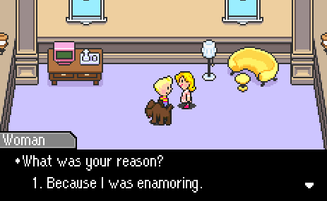 But like I said, there’s a lady alone in her hotel room, and if she doesn’t spit a line of dialogue that could have literally been lifted from EarthBound, then I’m a monkey’s peddler!