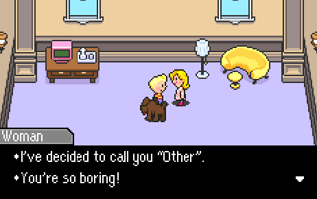 The other interaction I wanted to point out involves the woman alone in her hotel room. I’ve always found it funny that Mother games allow the play to, somewhat, freely explore hotels. It’s not something you’d think would be seen as normal, but again, compare Mother to the RPGs of its time: was it really ever normal to freely roam every room of a castle in a Final Fantasy game? Was it ever normal to break all the pots in someone’s room in a Zelda game? No, it’s not proper to break into someone’s hotel room, nor is it something you should really try to do in real life, but in a video game, who cares! You’re just a kid barging into people’s hotel rooms! Why not? You could even consider a head canon where Lucas doesn’t really understand the concept of hotels, and so just walks into people’s rooms.
