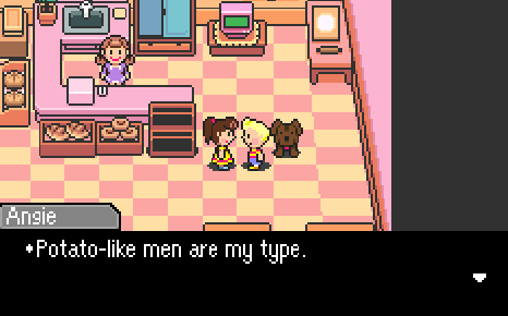 Though, one wonders: is Angie into potato-like men because she has spent nearly all of her childhood years, and now her early teen years, surrounded by Pigmasks? The glare of the Happy Box isn’t the only thing the townspeople have been subject to all these years; they’ve also lived alongside the Pigmask Army, and, in the case of the children, grown up surrounded by soldiers. As the old stereotypes go, kids in military families might go on to appreciate a person in uniform, if you catch my drift.