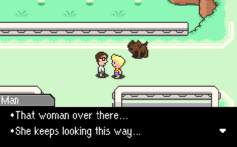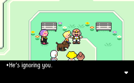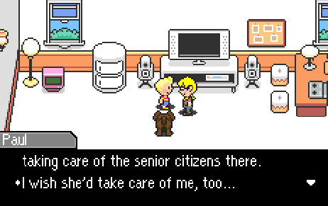 You might have also noticed that a few characters now have mentioned the retirement home to Lucas, and that is indeed where the game wants us to go, but compare this to Chapter 1’s streamlining. In Chapter 1, Pusher yelled to us, “North I say! North!’ whereas in Chapter 4, he’s a jerk to Lucas and he also happens to mention the retirement home. I’m not saying Mother 3 has drastically changed its linearity or anything (we haven’t tried leaving the town yet, and where would we go anyway?), but at least Mother 3 has acknowledged that the world has “grown,” and it can cool its jets (a bit) on always telling the player where to go.