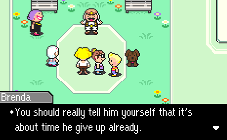 Brenda tells Lucas that it’s about time Flint gave up looking for Claus in the mountains. And see, I wouldn’t necessarily put it past the gossiping women to say something so direct about Flint (they criticized Flint right to his face in Chapter 1, somewhat jokingly but also foreshadowing his temper and strength), but it’s the tone she takes with Lucas that lacks empathy. Don’t forget: there was once a time where almost every single villager helped Flint search for Hinawa, in the middle of the night, in the middle of a storm. And while I do agree that it’s about time Flint came back home and spent some more time with Lucas, I don’t think it’s necessarily Brenda’s place to be throwing shade at the distraught cowboy and his broken family–but we know whose opinion we’re really hearing.