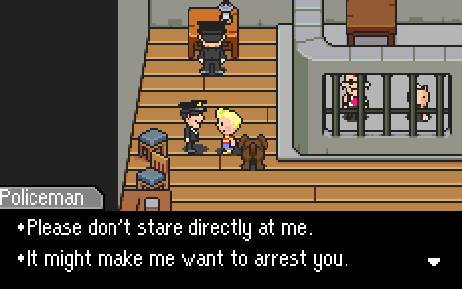 Of course, the Tazmily jail also gives us the amazing line: “Please don’t stare directly at me. It might make me want to arrest you.”