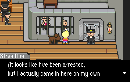In the same way that I enjoy Itoi’s cop-writing, I enjoy his dog-writing as well, especially his underdog writing with my beloved Stray Dog. In fact, what is on one paw a humorous situation (the Stray Dog jailing himself so as to have a home), is on the other paw perhaps a world-building detail. Why would the Stray Dog want to put himself in jail? Well, either he began facing endless harassments from the Pigmasks and Policemen, and so turned himself over, or perhaps he too noted the change in Tazmily. The new, improved, and paved town square isn’t exactly a place for a roaming dog and his mangy mug, and maybe Tazmilians used to actually pay attention to him before becoming so absorbed in their Happy Boxes. For these reasons, the Stray Dog abandoned the confusing world of warbling boxes and fascist tunes for the safety of four walls and a couple meals a day.