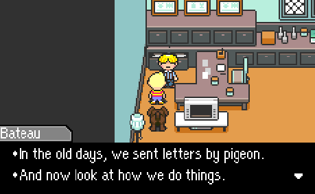 Well, what am I supposed to be seeing here, Bateau? A mail system? Look, call me civilized, but I’m basically okay with the fact that Tazmily has moved from pigeons to postal. I mean, is something really lost here? My poetic soul tells me yes; Tazmily has lost an opportunity to commune with nature, having animals carry their messages to and fro. But my brain tells me, what’s the big deal? So pigeons don’t carry letters anymore–good for them! Pigeons aren’t our servants!