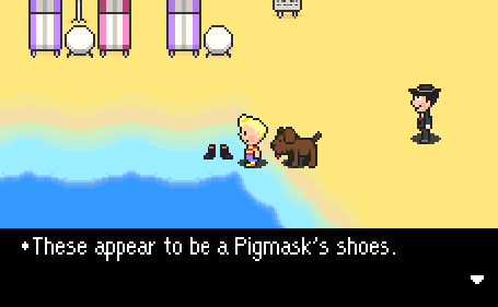 Now, Cerulean Beach never featured prominently in the early chapters of Mother 3, but I think enough happened here (the conversation between Lighter and Fuel, meeting up with Nana, for example) for the player to make a connection with it. That said, now that Cerulean Beach is populated with all kinds of NPCs, and sunbathing pigs, and save frogs, and even a Pigmask wading somewhere out at sea… well, it doesn’t feel wrong or anything, at least not in the same way it feels wrong to see Fassad hogging town square. It seems cool, it seems good, for Cerulean Beach to have people here who are enjoying it. Maybe I would feel differently if I had, say, seen Nana’s content-cut father get swallowed up by the Kraken on this very shore or something, but I’m mostly just happy to see people enjoying the beach.